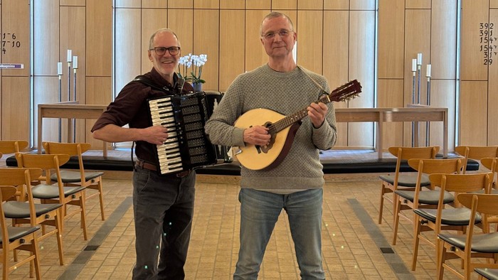 Knud spiller mandolin og Jannik spiller harmonika.